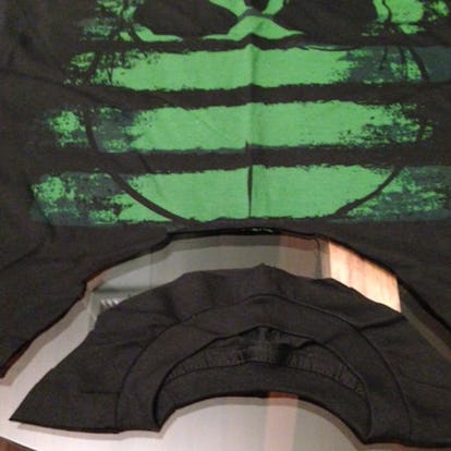 No mido. No uso Sharpies para marcar líneas sobre dónde cortar. Lo hago a ojo y ya está. Como son camisetas rockeras, o camisetas gráficas, y es algodón, los bordes se curvan ligeramente, lo que le da un aspecto aún más personalizado.