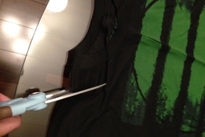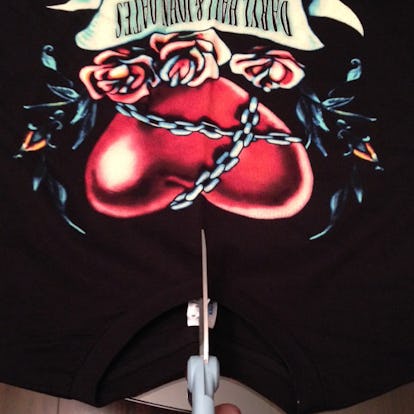 Como publicista y escritora de música, montones de grupos me dan camisetas gratis, que me pongo con mucho gusto. Me encanta una buena camiseta de rock. Pero a menudo eran camisetas de hombre en tallas pequeñas o medianas, que no abrazaban exactamente mis curvas. Acababan apiladas en mi armario, hasta que decidí tomar la iniciativa. Compré un par de tijeras para tela en Target y decidí cortar las camisetas hasta que se vieran más bonitas, sexys y favorecedoras para mi figura.